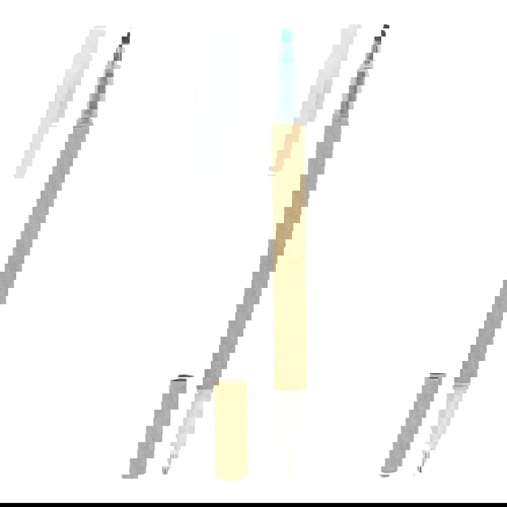 Textmarker in Kombination mit einem Kugelschreiber. Der Textmarker ist in verschiedenen Schreibfarben erhältlich und der Kugelschreiber hat eine blaue Mine.