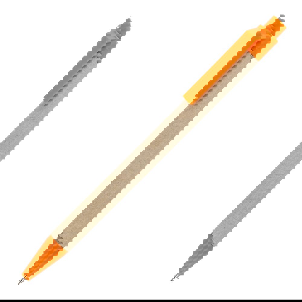 Papierkugelschreiber mit farbigen Kunststoffteilen aus recyceltem Material. Mit blauer Schreibmine.