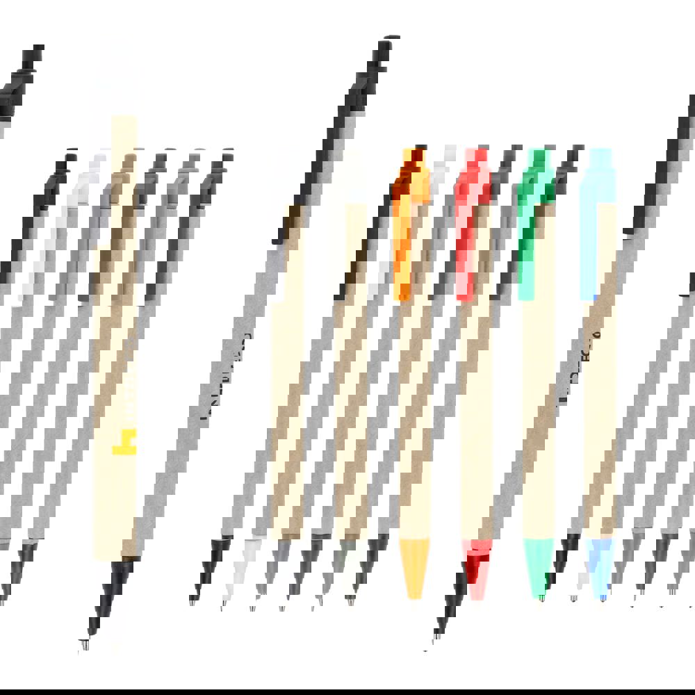 Papierkugelschreiber mit farbigen Kunststoffteilen aus recyceltem Material. Mit blauer Schreibmine.