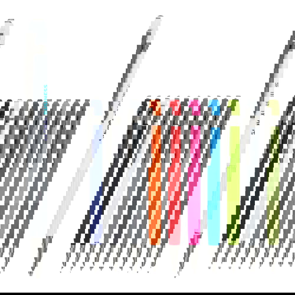 Eleganter Aluminium-Kugelschreiber mit Metallclip. Mit beliebten vertikalen Streifen auf dem Schaft und dem Druckknopf. Der Stift wird mit blauer Tinte geliefert.