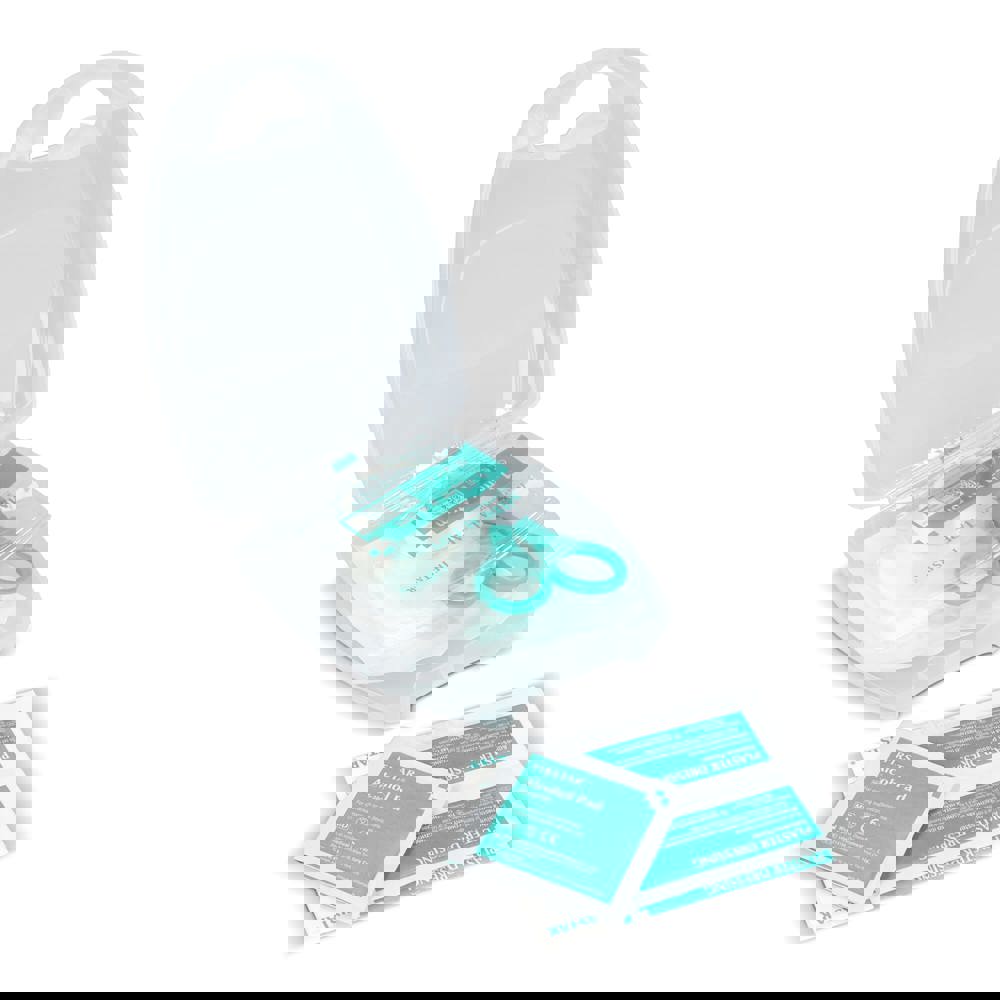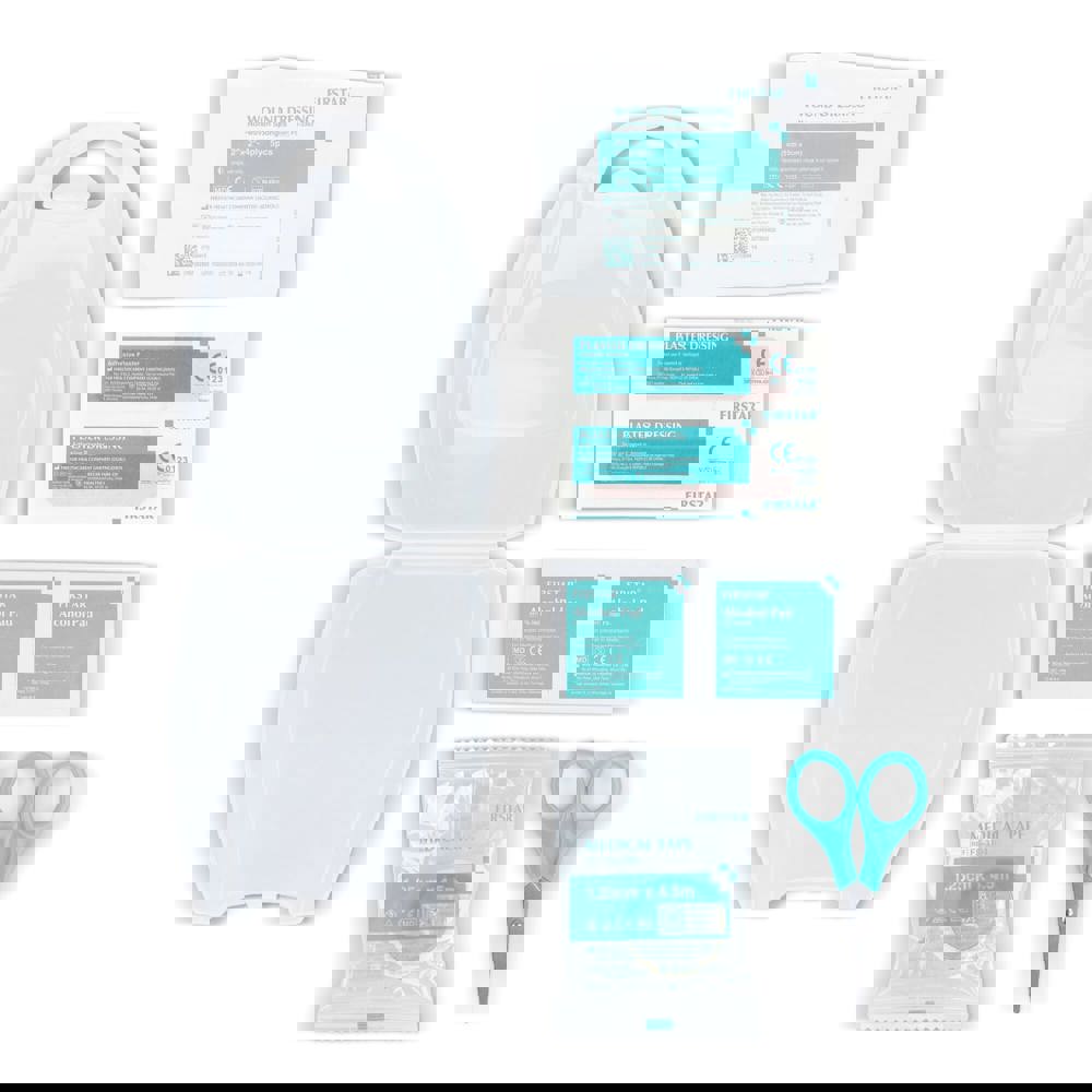 Kompaktes Erste-Hilfe-Set im stabilen PP-Koffer, entspricht europäischen Normen. Ideal für Reisen, Büro oder als Werbegeschenk. Enthält wichtige Artikel für kleine Verletzungen: 2 Alkoholtupfer, 5 Pflaster 72×19 mm, 1 Schere, 1 medizinisches Klebeband 1,25 cm×4,5 m, 1 Packung mit 5 Vlies-Schwämmen 2"×2", 4-lagig.