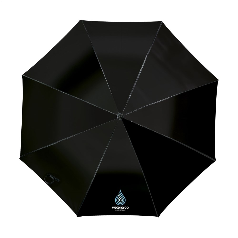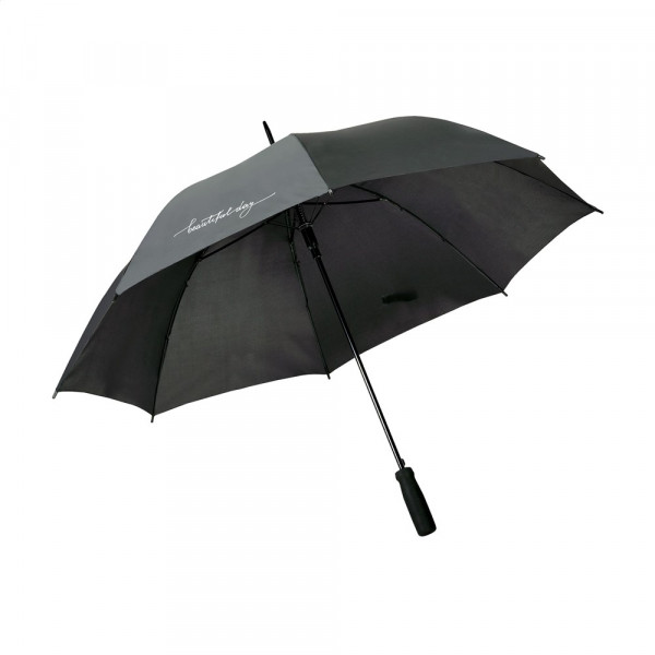 Regenschirm mit automatischer Teleskopöffnung, 190T Polyester-Bespannung, Fiberglasrahmen, Metallschaft, Softgriff und Klettverschluss.