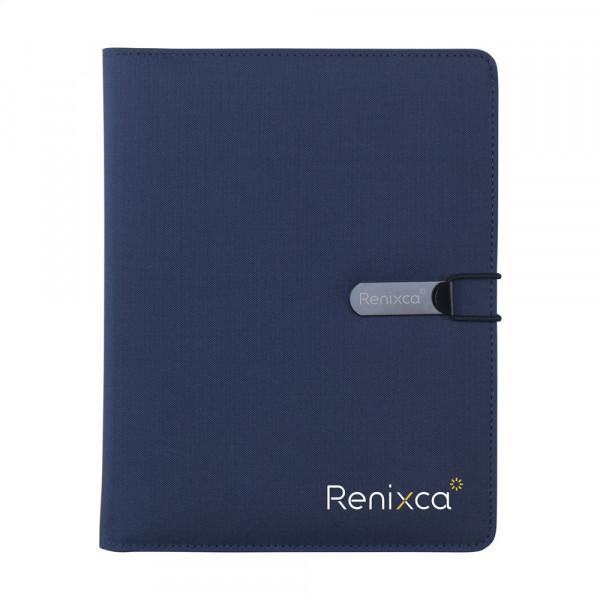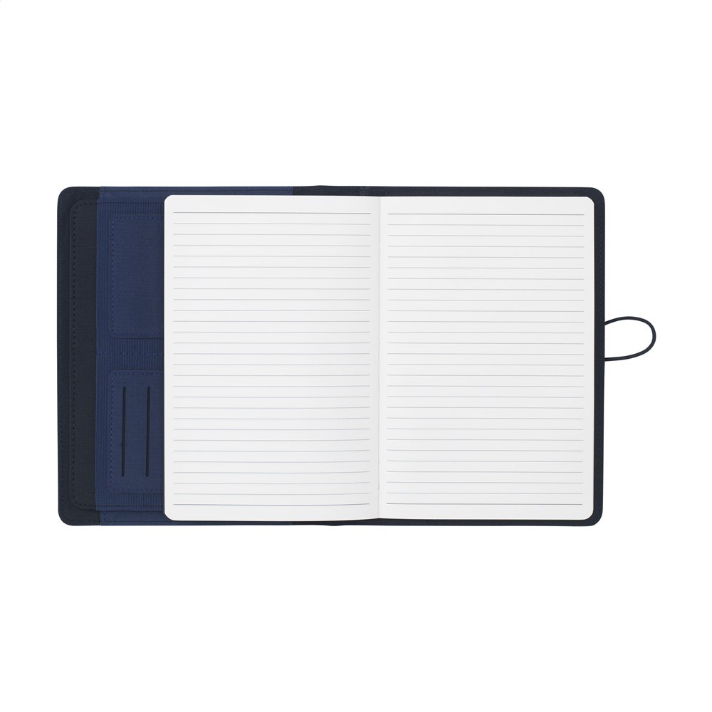Moderne Schreibmappe/Dokumentenmappe aus RPET-Material im A5-Format. Ausgestattet mit mehreren Einsteckfächern, darunter ein separates Fach für ein Mobiltelefon, 2 Kartenfächer und eine Stiftschlaufe.Inkl. Notizbuch mit ca. 64 Blatt FSC zertifiziertem, cremefarbenem, liniertem Papier (70 g/m²).