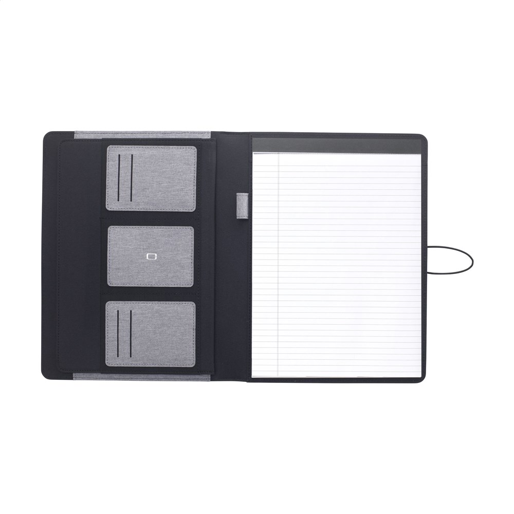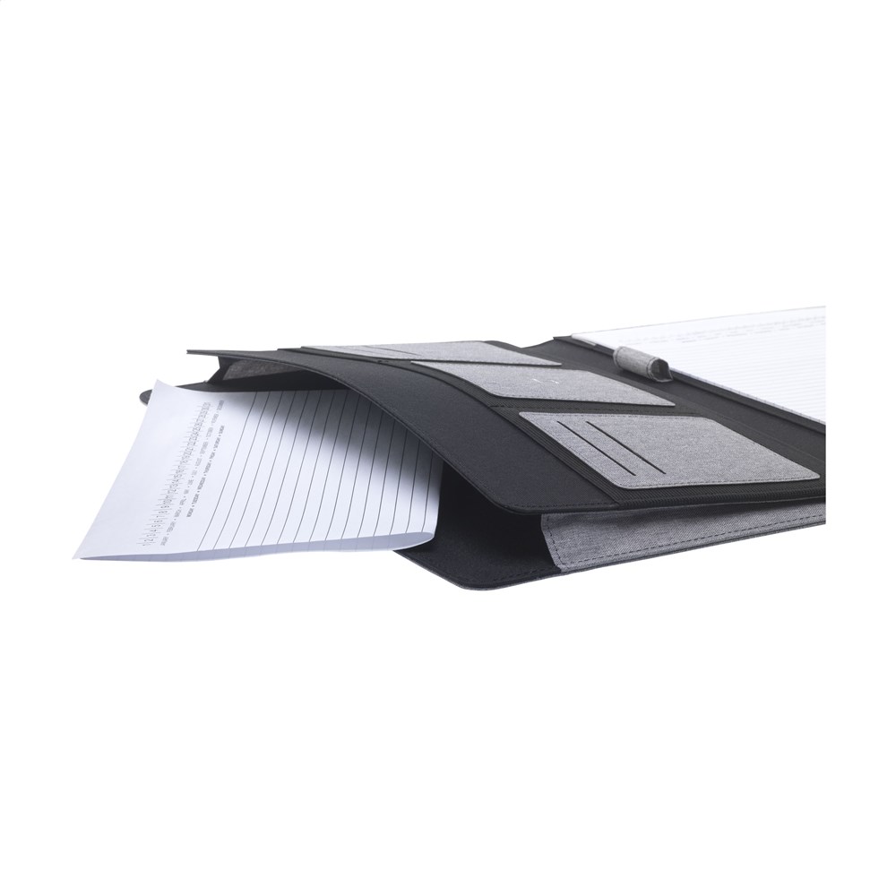 Moderne Schreibmappe/Dokumentenmappe aus RPET-Material im A4-Format. Ausgestattet mit mehreren Einsteckfächern, darunter ein separates Fach zur Aufbewahrung eines Mobiltelefons, sowie einer Stiftschlaufe. Inkl. Schreibblock mit 20 Blatt FSC zertifiziertem, weißem, liniertem Papier (70 g/m²). RCS-certified. Total recycled material: 6%.