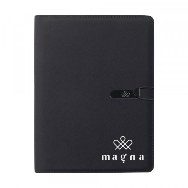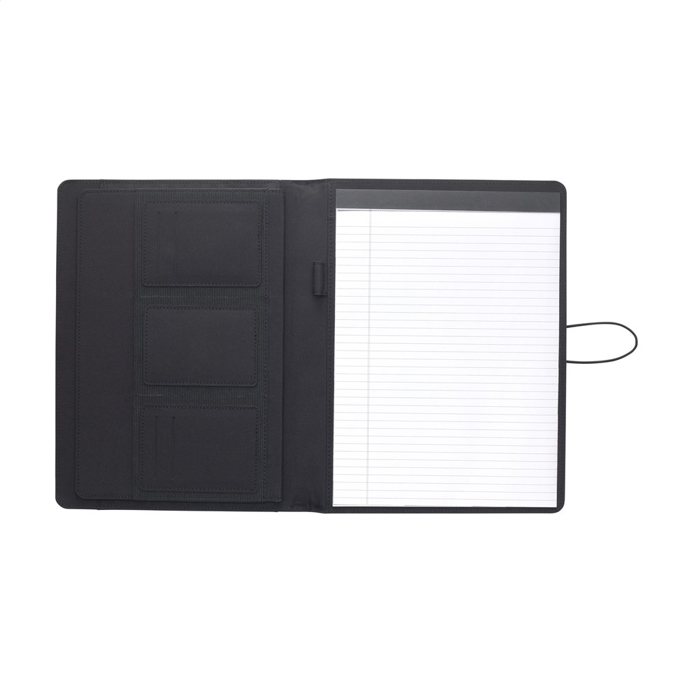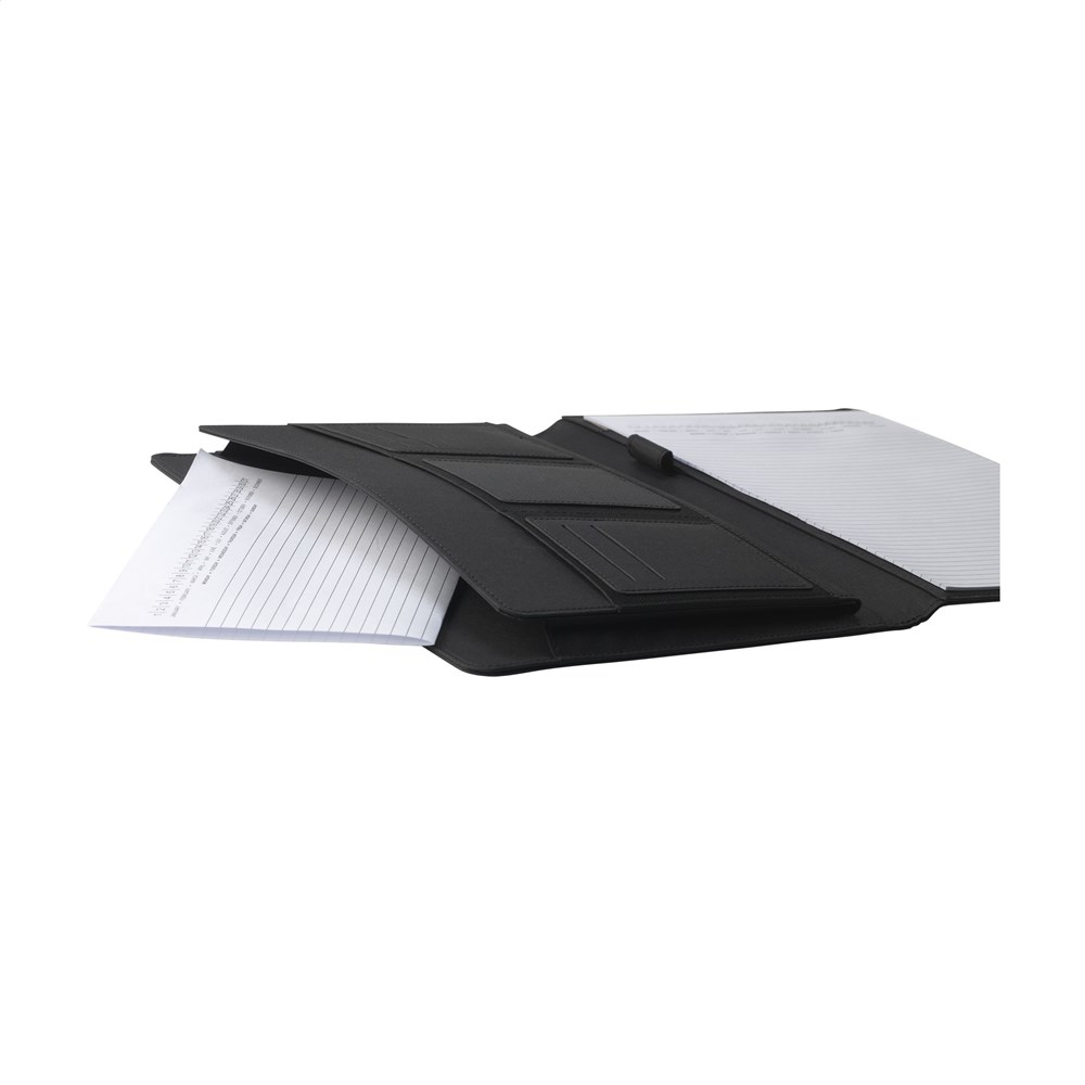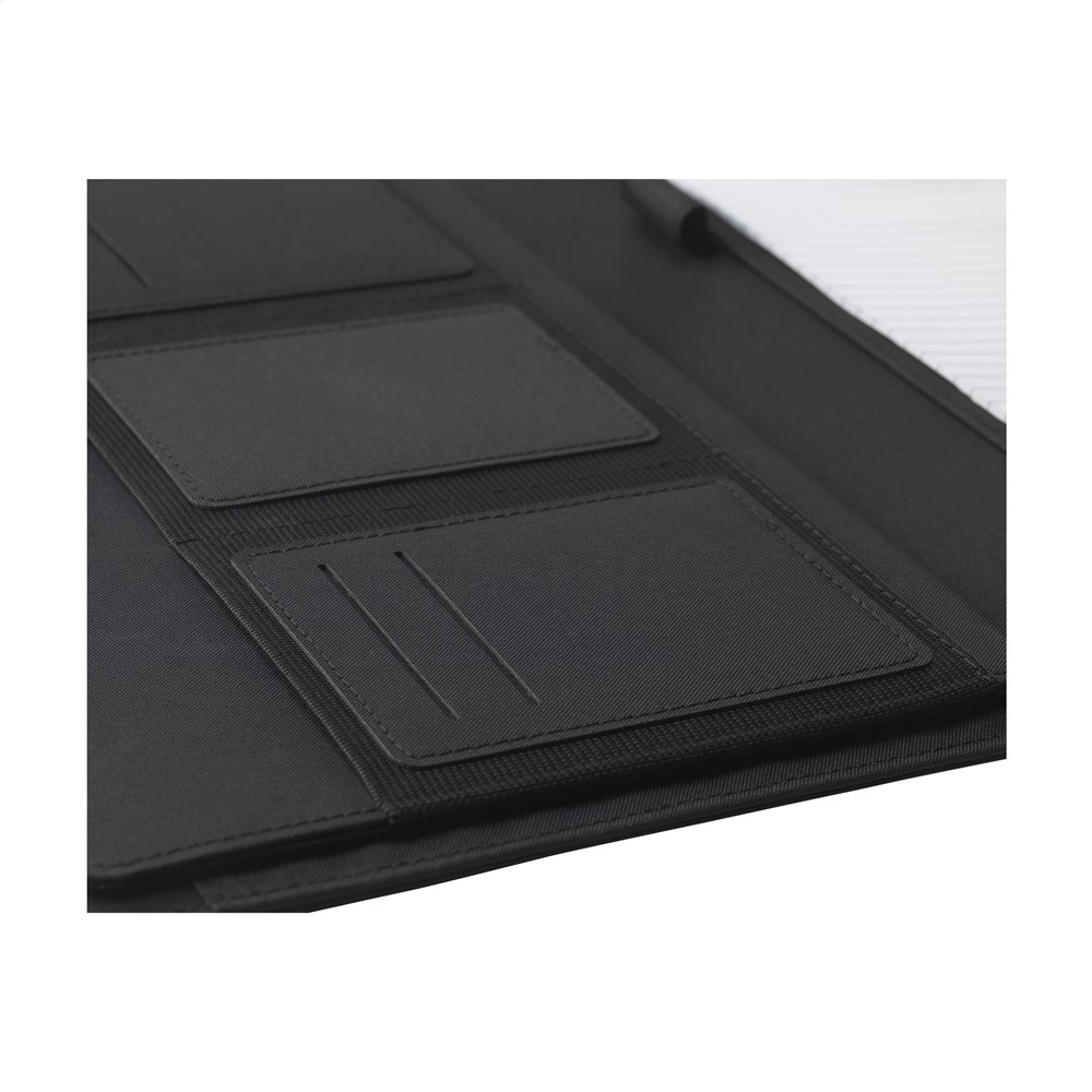 Moderne Schreibmappe/Dokumentenmappe aus RPET-Material im A4-Format. Ausgestattet mit mehreren Einsteckfächern, darunter ein separates Fach zur Aufbewahrung eines Mobiltelefons, sowie einer Stiftschlaufe. Inkl. Schreibblock mit 20 Blatt FSC zertifiziertem, weißem, liniertem Papier (70 g/m²). RCS-certified. Total recycled material: 6%.