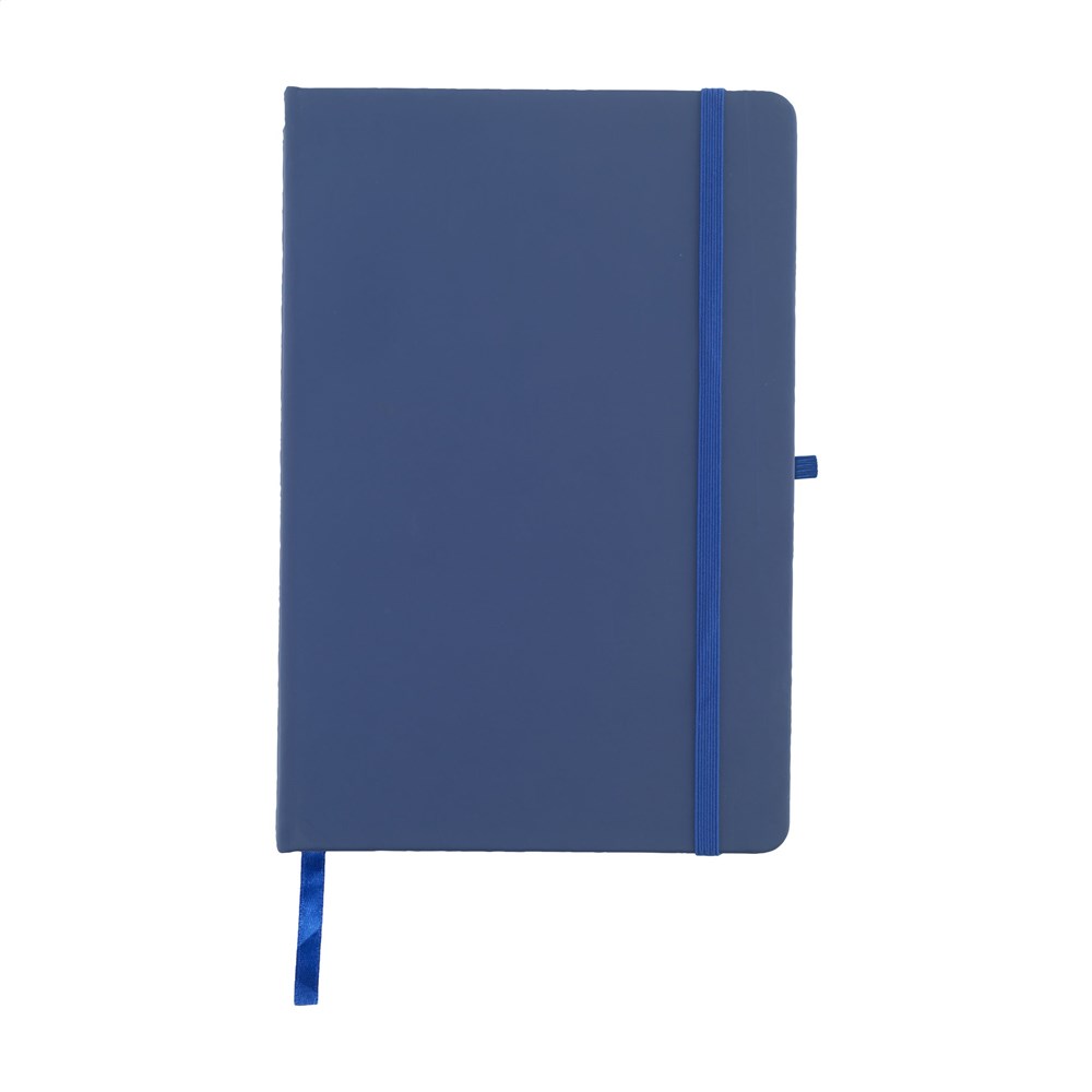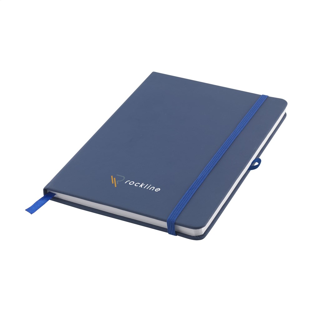 Praktisches Notizbuch im A5-Format. Mit hartem RPET-Cover und ca. 80 Blatt/160 Seiten cremefarbenem, liniertem Papier (70 g/m²). Mit praktischem Verschlussgummiband, Lesezeichen und Stiftschlaufe.