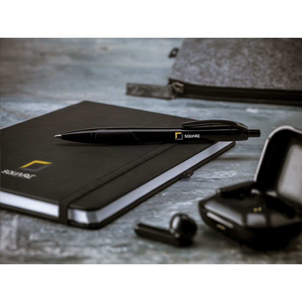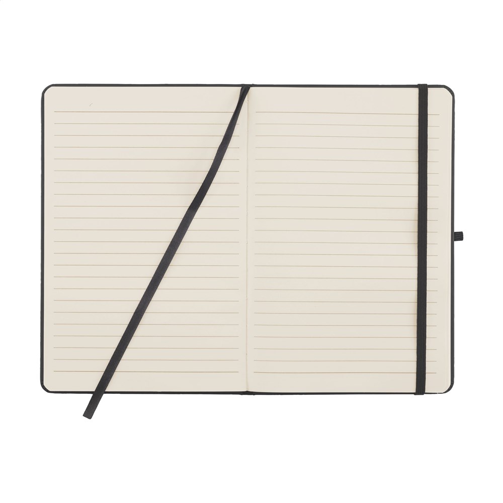 Praktisches Notizbuch im A5-Format. Mit hartem RPET-Cover und ca. 80 Blatt/160 Seiten cremefarbenem, liniertem Papier (70 g/m²). Mit praktischem Verschlussgummiband, Lesezeichen und Stiftschlaufe.