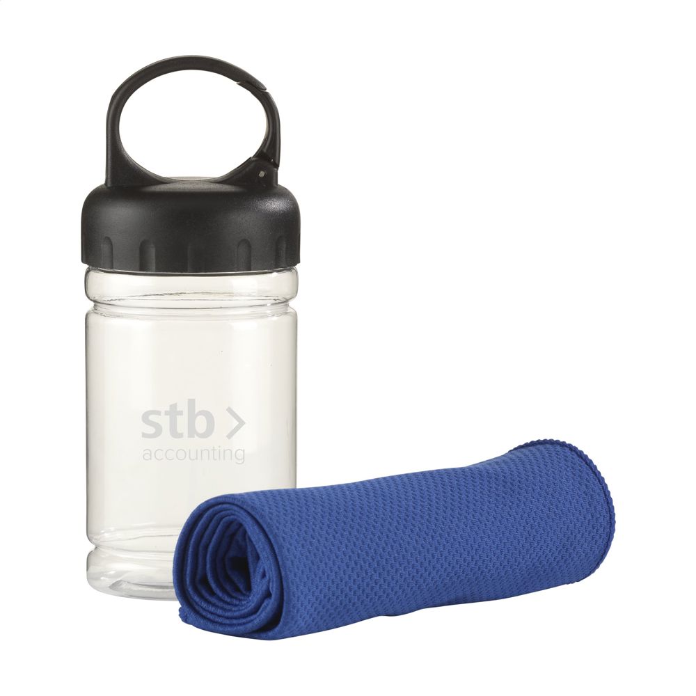 Spezielles Kühlhandtuch aus 100 % Polyester. Nach dem Eintauchen in kaltes Wasser kann dieses Handtuch bei sportlichen Aktivitäten oder Sonnenbrand kühlen. Maße 30 x 80 cm. Ideales Format, um es zur Kühlung im Nacken zu tragen. In transparentem Gehäuse mit ABS-Schraubverschluss mit Karabinerhaken.