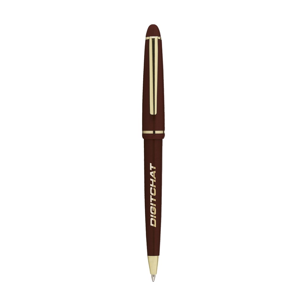 Blauschreibender Kugelschreiber mit poliertem Gehäuse, vergoldetem, zierlichem Clip und Spitze und Druckkappensystem.