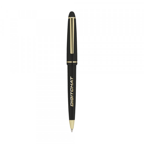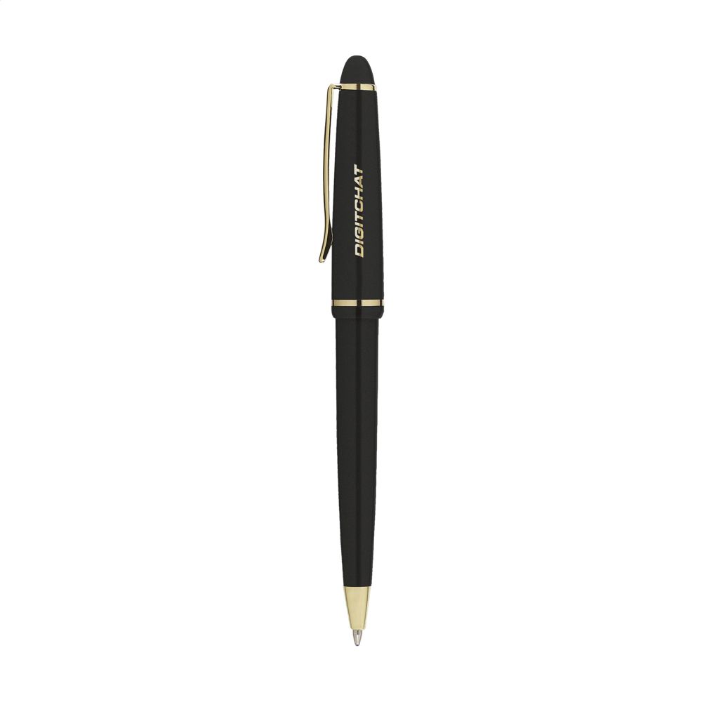 Blauschreibender Kugelschreiber mit poliertem Gehäuse, vergoldetem, zierlichem Clip und Spitze und Druckkappensystem.