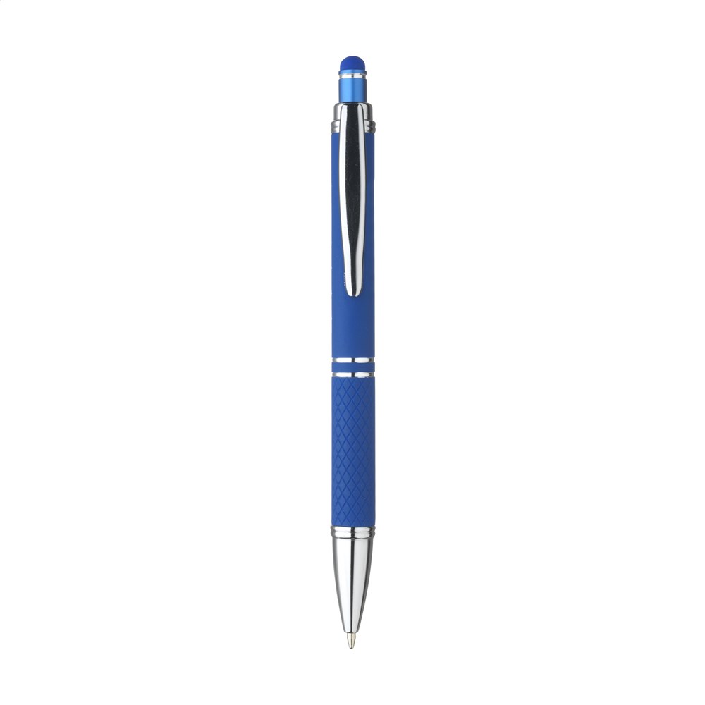 Blauschreibender Aluminium-Kugelschreiber mit Metallclip und gummierter Spitze für das Bedienen von Touchscreens (wie iPhone/iPad). Der Halter ist mit einer schönen gummierte Soft-Touch-Oberfläche versehen. Auf dem Vorderteil ist ein spielerisches Relief angebracht, das für einen festen Griff sorgt. Bei diesem Stift wurde viel Wert auf kleine zusätzliche Details gelegt. Das macht sein Design auffallend attraktiv.