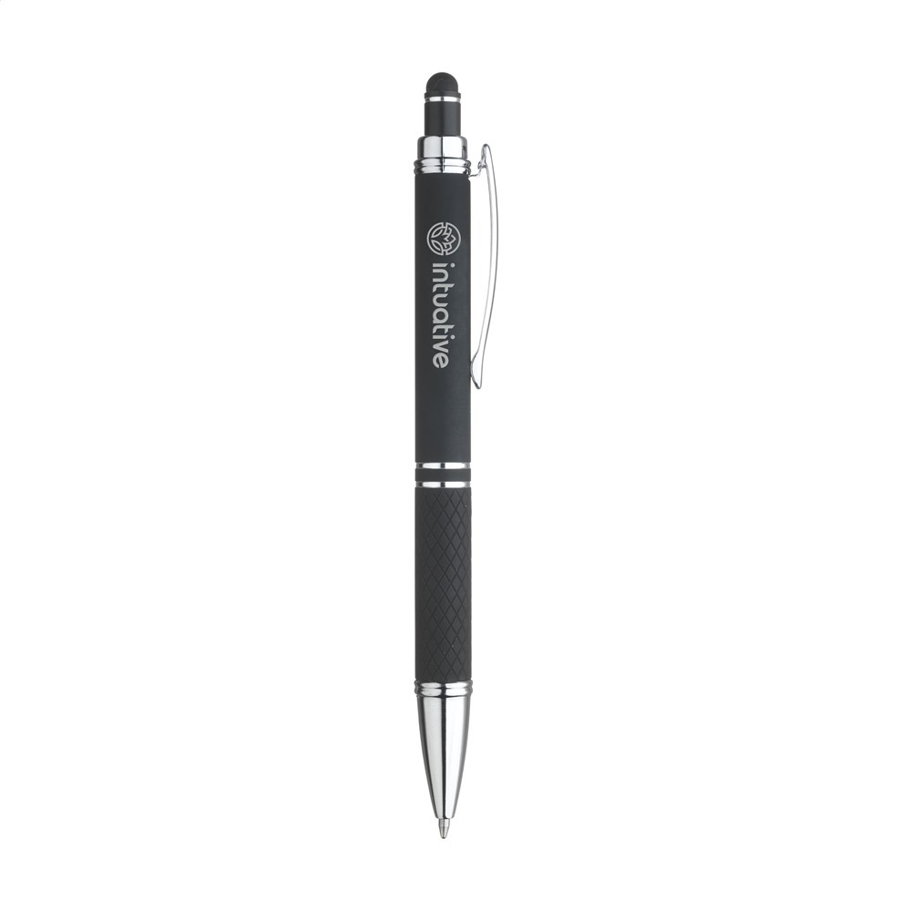 Blauschreibender Aluminium-Kugelschreiber mit Metallclip und gummierter Spitze für das Bedienen von Touchscreens (wie iPhone/iPad). Der Halter ist mit einer schönen gummierte Soft-Touch-Oberfläche versehen. Auf dem Vorderteil ist ein spielerisches Relief angebracht, das für einen festen Griff sorgt. Bei diesem Stift wurde viel Wert auf kleine zusätzliche Details gelegt. Das macht sein Design auffallend attraktiv.