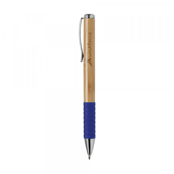 Blauschreibender Kugelschreiber mit Gehäuse aus Bambus, Metallclip, Dreh-Klicksystem und farbigem, gummiertem, grifffestem Vorderteil.