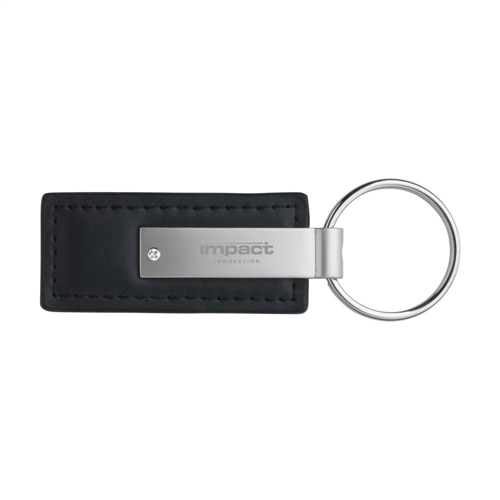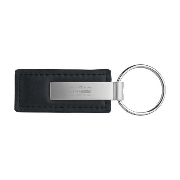 Mattmetallener Schlüsselanhänger mit stabilem Schlüsselring, kombiniert mit Imitatleder. Verpackt pro Stück.