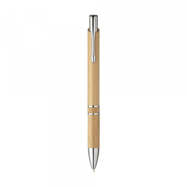 Blau- oder schwarzschreibender Kugelschreiber mit schickem Bambusgehäuse, Chromringen und Metallclip/-druckknopf.