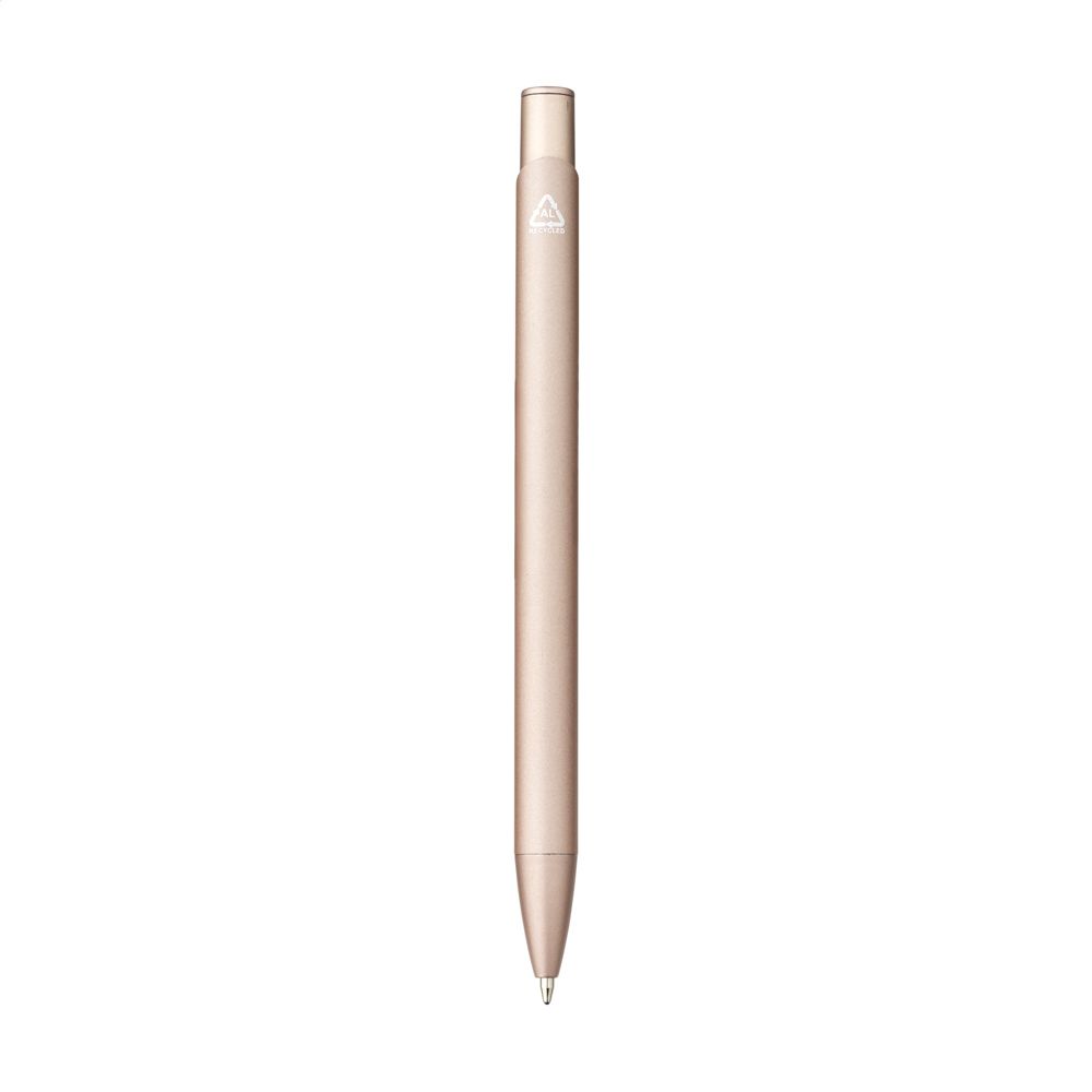 Blau schreibender Kugelschreiber mit einem Gehäuse aus 100% recyceltem Aluminium. Mit Metallclip, Kunststoffspitze und Druckknopf. RCS-zertifiziert. Durch die Verwendung von recyceltem Aluminium werden bei der Herstellung dieses Produkts weniger neue Rohstoffe verwendet. Das bedeutet weniger Energieverbrauch und weniger Wasserverbrauch.