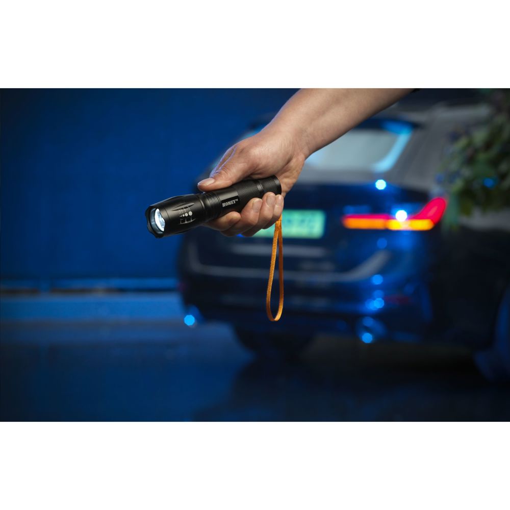 Kompakte, leichte Aluminium-Taschenlampe der Marke Homey's. Mit T6 LED (200 Lumen). Diese vielseitige Lampe verfügt über ein Blitzlicht, eine SOS-Funktion und eine Zoomfunktion in drei Einstellungen. Zoomen Sie hinein, um einen konzentrierten Lichtstrahl auf bestimmte Bereiche zu richten, oder heraus, um einen größeren Beleuchtungsbereich zu erreichen. Maximale Nutzungsdauer 3,5 Stunden. Reichweite 150 Meter. Wasserfest (IP55). Geeignet für Heimwerker, Outdoor-Aktivitäten und Notfälle. Inklusive Handschlaufe und Batterien. Verpackt pro Stück.