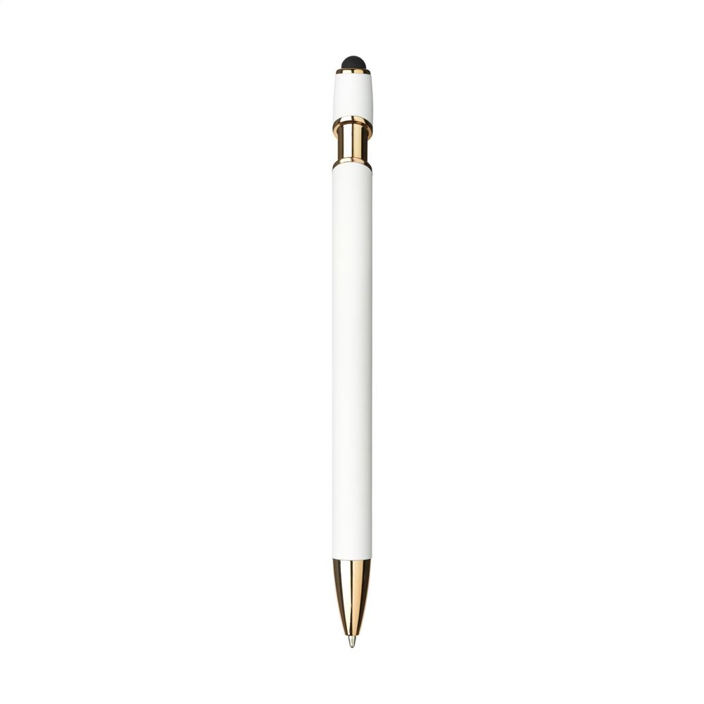 Blauschreibender Kugelschreiber mit Gehäuse aus recyceltem Aluminium und einer Kupferlegierung. Die roségoldenen Akzente verleihen dem Stift ein elegantes Aussehen. Das Gehäuse ist mit einer gummierten Soft-Touch-Oberfläche und einer gummierten Spitze/Zeiger zum Bedienen von Touchscreens versehen. Mit Metallclip. RCS-zertifiziert. Gesamtes recyceltes Material: 94%. Hergestellt in Europa. Durch die Verwendung von recyceltem Aluminium werden bei der Herstellung dieses Produkts weniger neue Rohstoffe verwendet. Das bedeutet weniger Energieverbrauch und weniger Wasserverbrauch.
