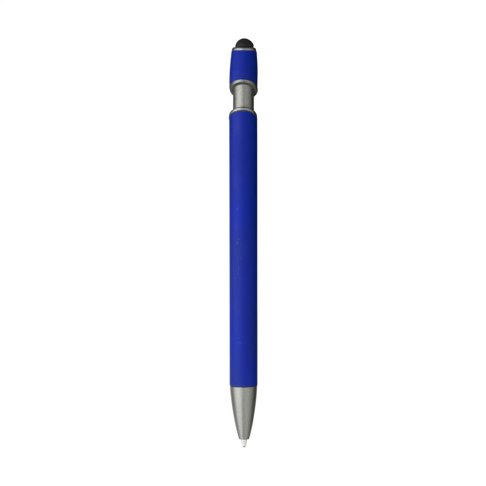 Blauschreibender Kugelschreiber mit einem Gehäuse aus recyceltem Aluminium. Das Gehäuse verfügt über eine gummierte Soft-Touch-Oberfläche und eine Gummispitze zum Bedienen von Touchscreens. Mit Metallclip. RCS-zertifiziert. Gesamtes recyceltes Material: 94%. Durch die Verwendung von recyceltem Aluminium werden bei der Herstellung dieses Produkts weniger neue Rohstoffe verwendet. Das bedeutet weniger Energieverbrauch und weniger Wasserverbrauch.