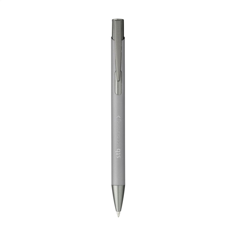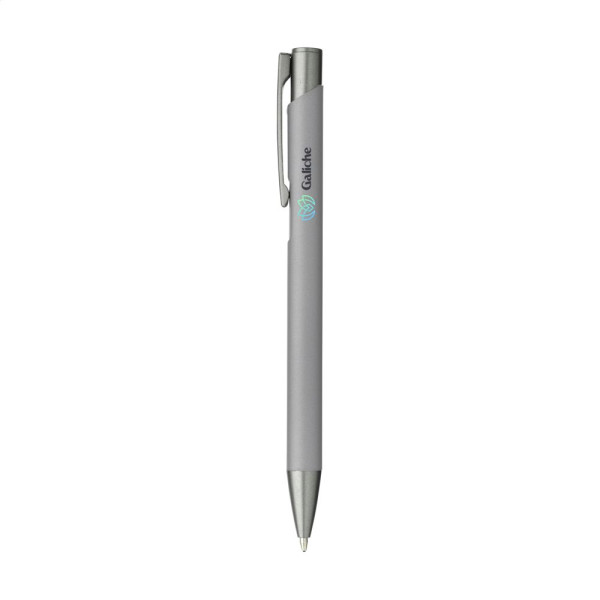 Blauschreibender Kugelschreiber mit einem Gehäuse aus recyceltem Aluminium. Das Gehäuse ist mit einer gummierten Soft-Touch-Oberfläche versehen. Mit Metallclip/Druckknopf. RCS-zertifiziert. Gesamtes recyceltes Material: 94%. Durch die Verwendung von recyceltem Aluminium werden bei der Herstellung dieses Produkts weniger neue Rohstoffe verwendet. Das bedeutet weniger Energieverbrauch und weniger Wasserverbrauch.