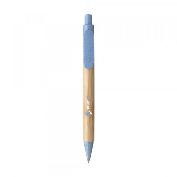 Blauschreibender Kugelschreiber mit Bambusgehäuse. Der Clip, der Druckknopf und die Spitze sind hergestellt aus Weizenstroh/PP-Kunststoff.