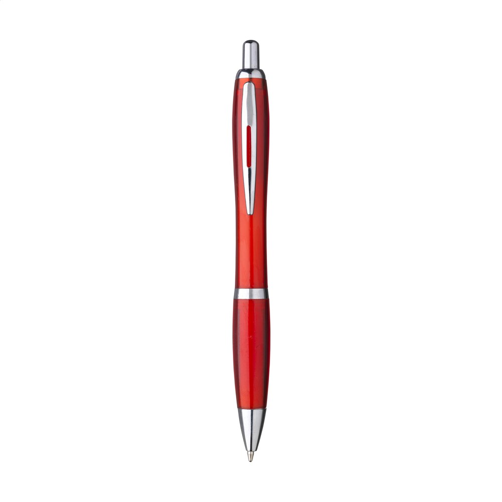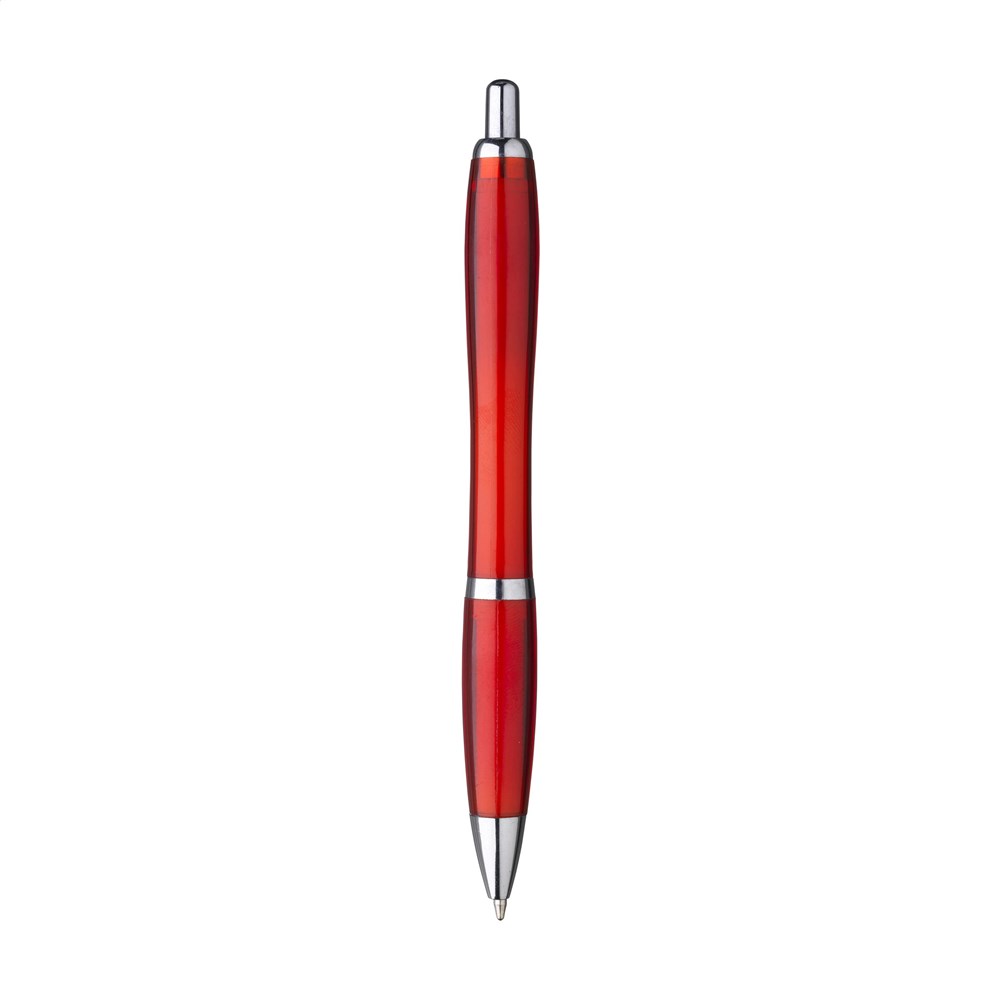 Blauschreibender Kugelschreiber mit transparentem Gehäuse hergestellt aus 100% recyceltem PET. Mit Hochglanzakzenten und Metallclip.