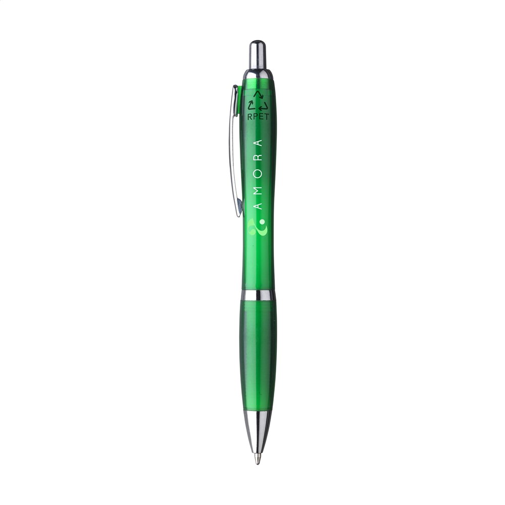 Blauschreibender Kugelschreiber mit transparentem Gehäuse hergestellt aus 100% recyceltem PET. Mit Hochglanzakzenten und Metallclip.