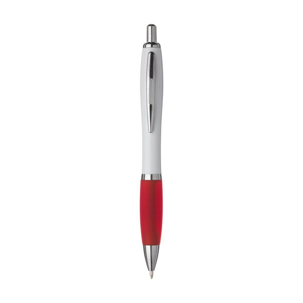 Blauschreibender oder schwarzschreibender Kugelschreiber mit weißem Gehäuse, farbigem, grifffestem Vorderstück und Metallclip.
