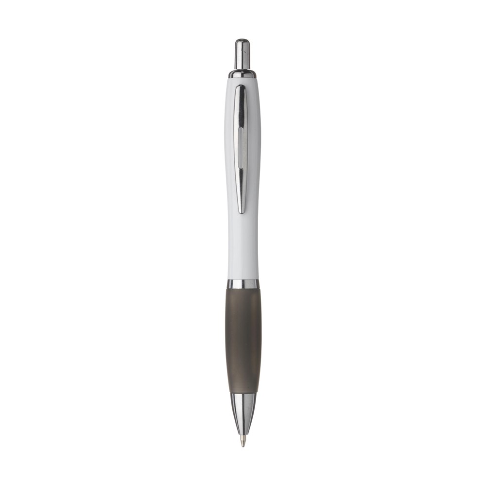 Blauschreibender oder schwarzschreibender Kugelschreiber mit weißem Gehäuse, farbigem, grifffestem Vorderstück und Metallclip.