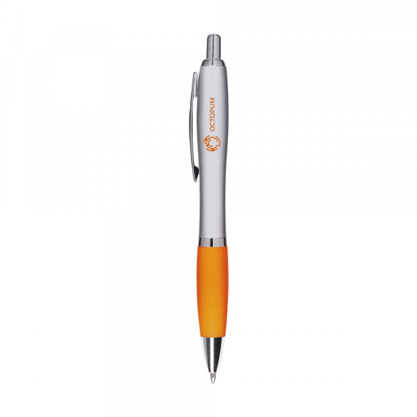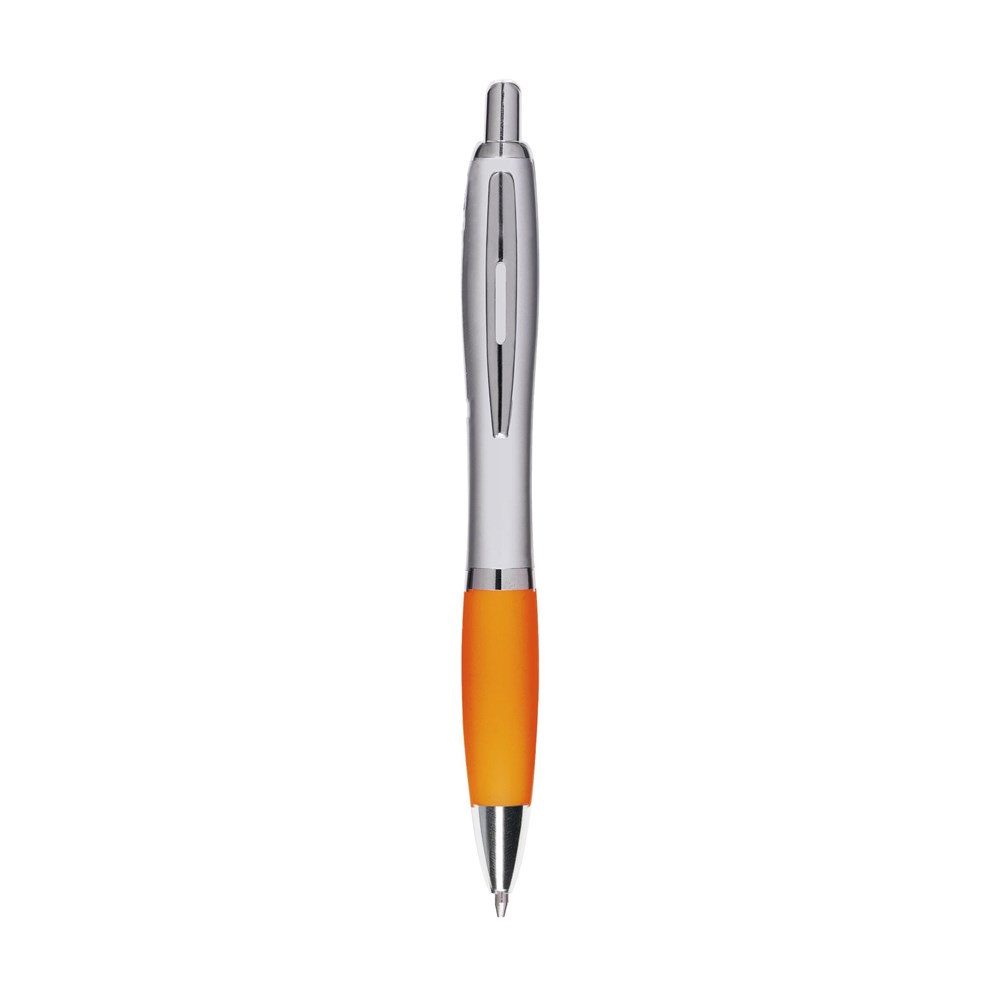 Blauschreibender Kugelschreiber mit farbigem, grifffestem Vorderteil und Metallclip.