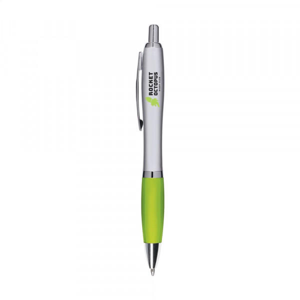 Blauschreibender Kugelschreiber mit farbigem, grifffestem Vorderteil und Metallclip. mehr