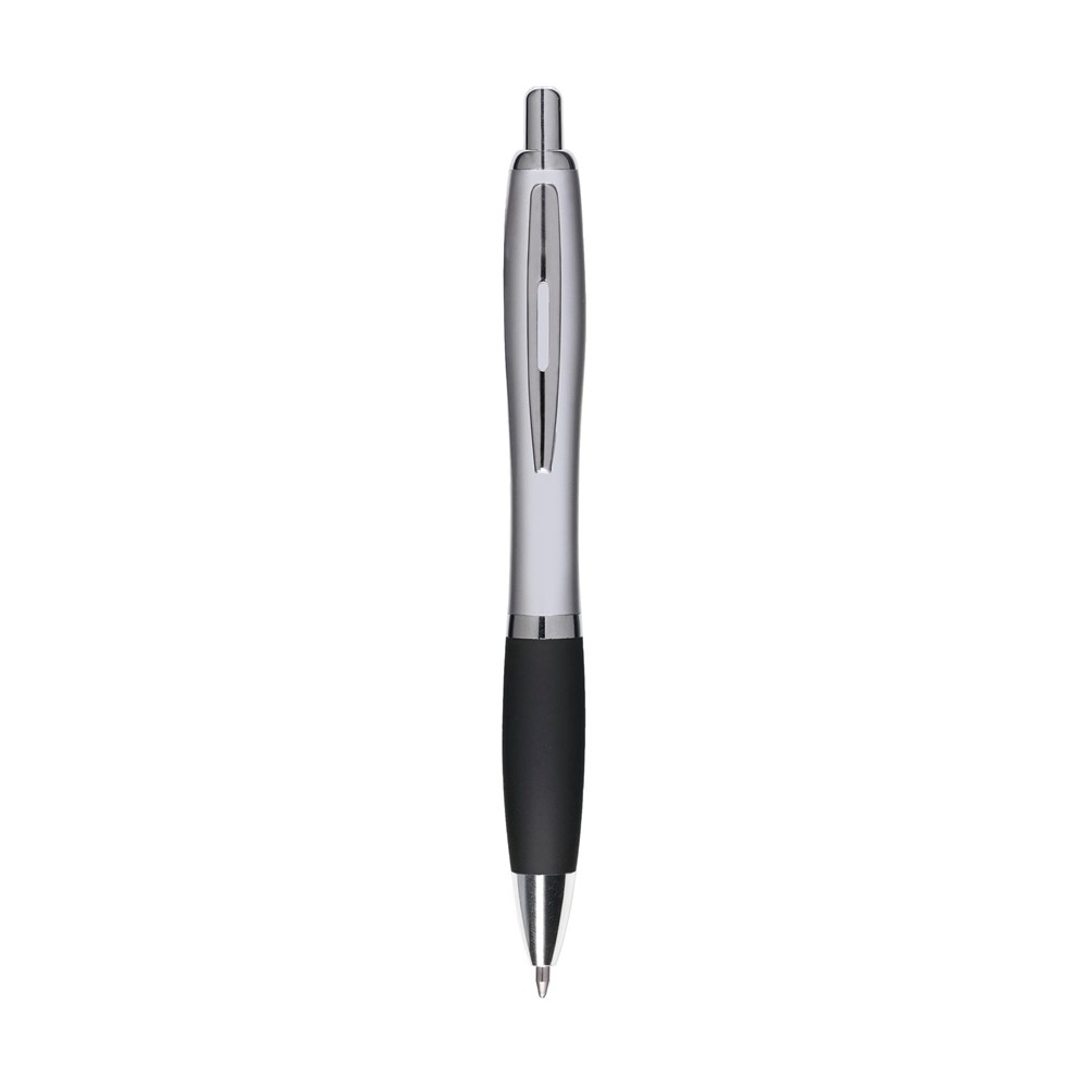 Blauschreibender Kugelschreiber mit farbigem, grifffestem Vorderteil und Metallclip.