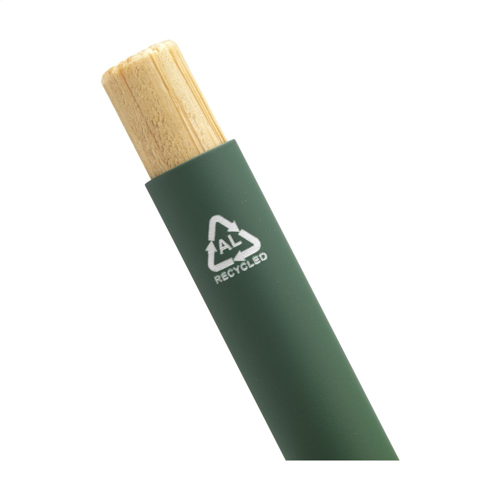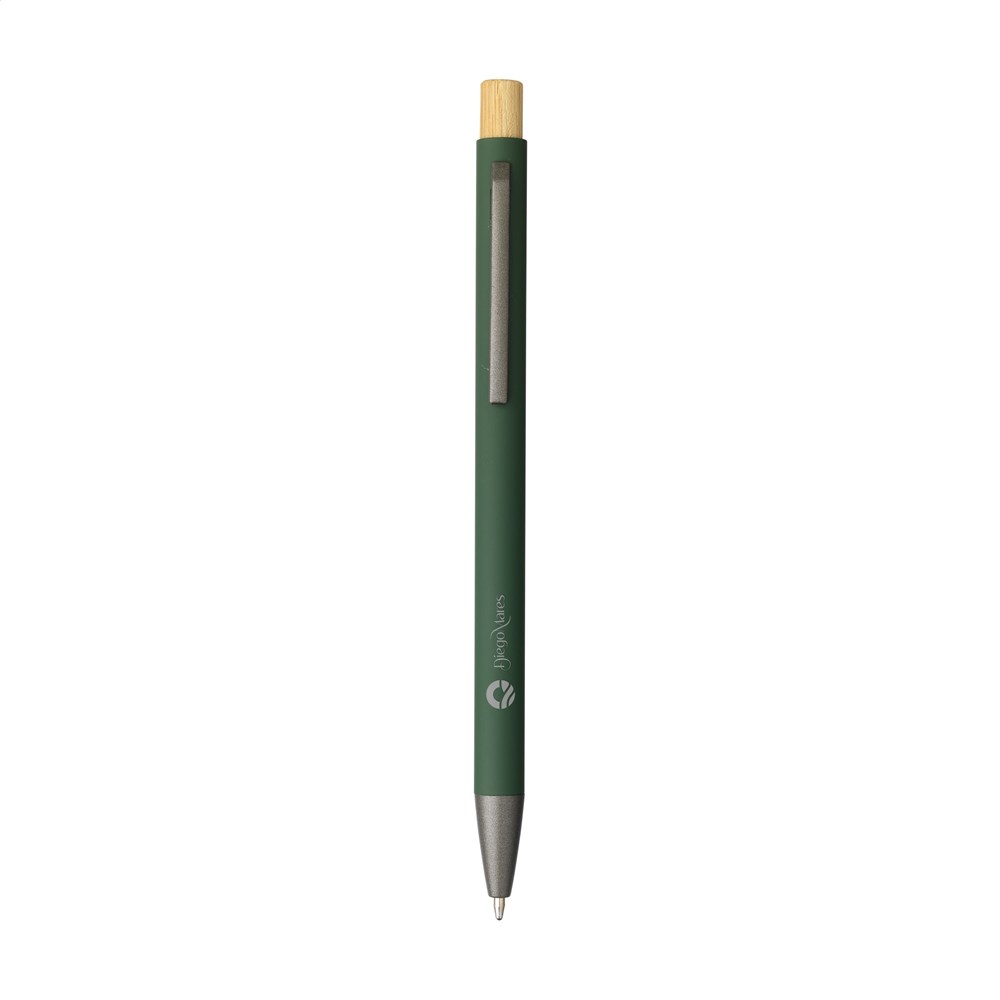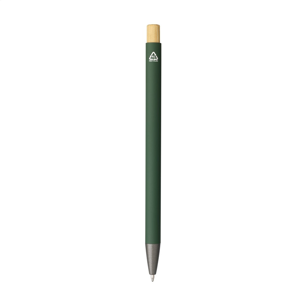 Blauschreibender, schlanker Kugelschreiber mit einem Gehäuse aus 100% recyceltem Aluminium mit gummierter Oberfläche. Metallclip. Schlankes Design. Der Bambus-Druckknopf verleiht dem Stift eine natürlicher Akzent. GRS-zertifiziert. Durch die Verwendung von recyceltem Aluminium kommt eine geringere Menge an neuen Rohstoffen zum Einsatz. Das bedeutet weniger Energieverbrauch und weniger Wasserverbrauch.