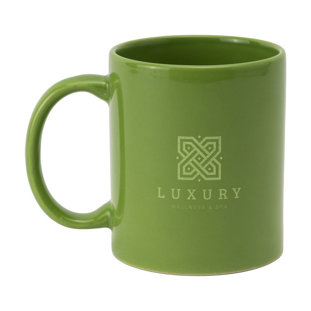 Becher aus hochwertiger Keramik. Komplett in weiß oder mit farbiger Außenseite. Spülmaschinengeeignet. Der Aufdruck ist spülmaschinengeprüft und nach EN 12875-2 zertifiziert. Fassungsvermögen 350 ml.