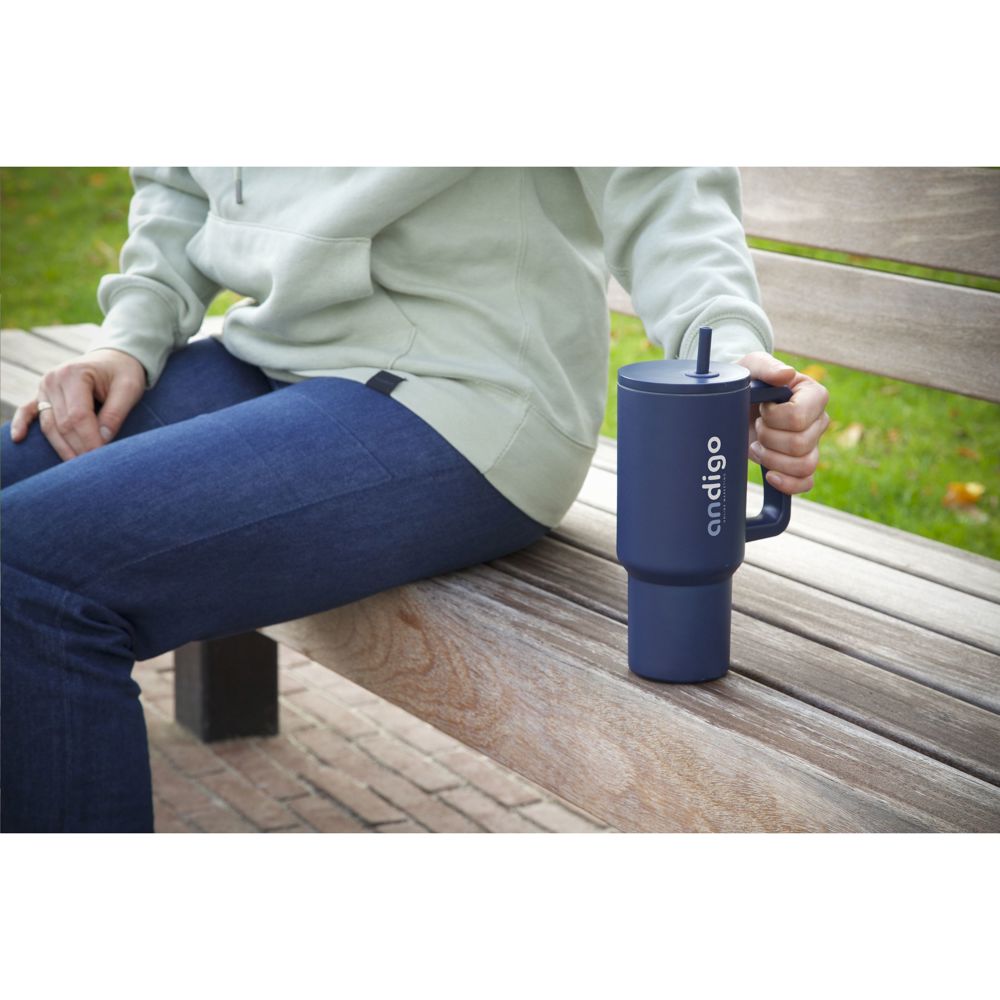Großer, doppelwandiger Trinkbecher aus recyceltem Edelstahl mit Strohhalm. Der auffällige, robuste Becher hat einen großen Kunststoffgriff und einen Schraubdeckel mit einer Öffnung für den mitgelieferten Kunststoffstrohhalm. Dieser große Becher hält Getränke über längere Zeit auf Temperatur. Geeignet für kalte und heiße Getränke. Auch ohne Strohhalm geht die Temperatur dank der Silikondichtung im Deckel nicht verloren. Dieser Becher kann überall hin mitgenommen werden. Ideal für das Fitnessstudio oder das Büro. Dank des konischen, schmalen Bodens passt der Becher in fast jeden Becherhalter und ist somit perfekt für unterwegs. Nicht spülmaschinengeeignet. RCS-zertifiziert. Gesamtes recyceltes Material: 75%. Fassungsvermögen: 900 ml. Verpackt pro Stück.