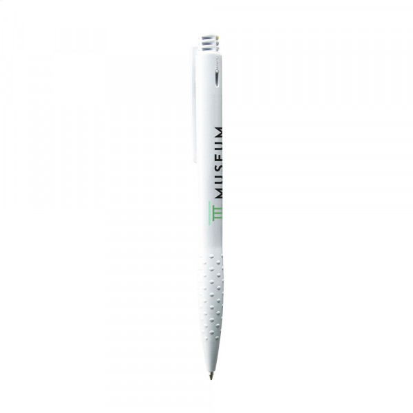 Blauschreibender oder schwarzschreibender Kugelschreiber mit grifffestem Vorderteil, farbigem Clip und Druckknopf.