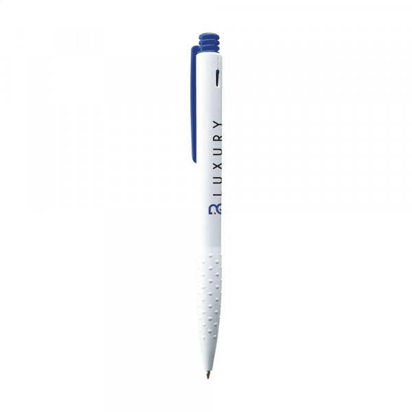 Blauschreibender oder schwarzschreibender Kugelschreiber mit grifffestem Vorderteil, farbigem Clip und Druckknopf.