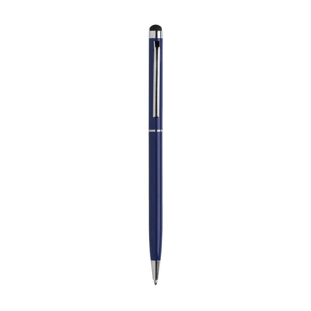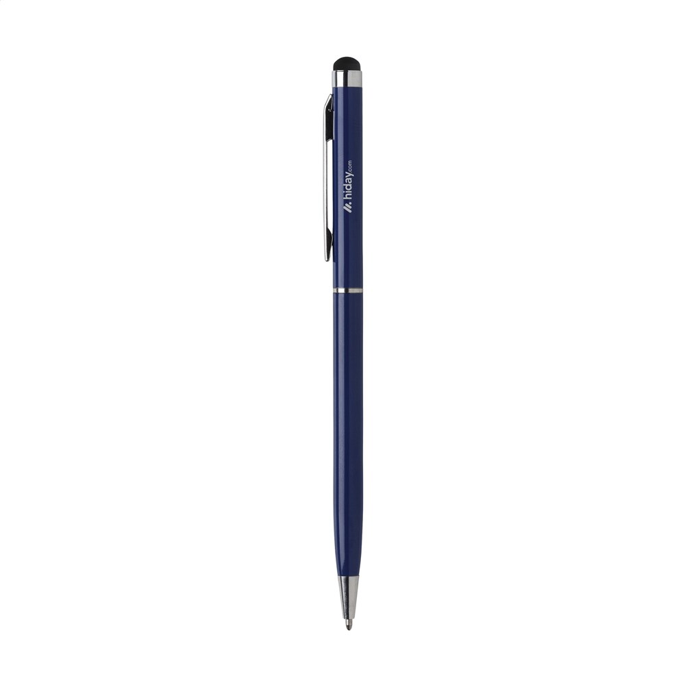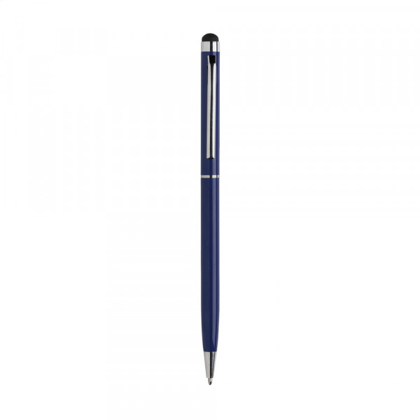 Blauschreibender Metallkugelschreiber mit gummiertem Pointer zum Bedienen von Touchscreens (wie iPhone/iPad), hochglänzenden Akzenten und Dreh-Klicksystem.