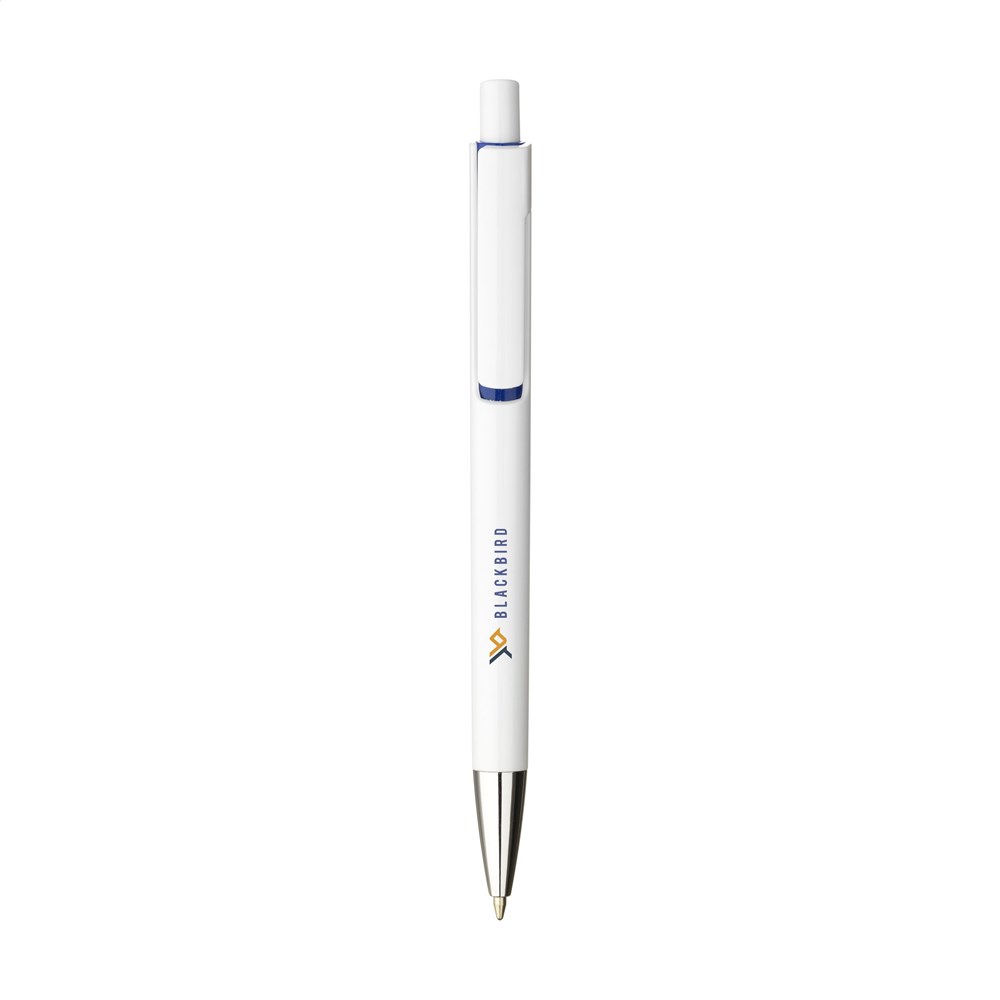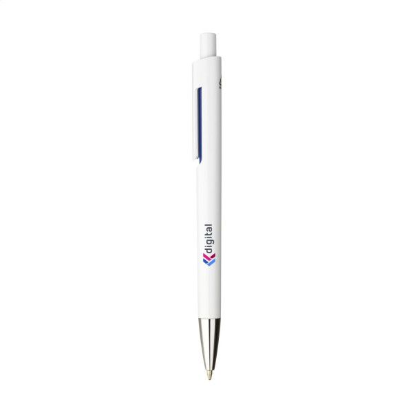 Blauschreibender Kugelschreiber mit einem Gehäuse aus recyceltem ABS. Mit einzigartigem Design: das Gehäuse und der Clip von diesem Kugelschreiber sind aus 'einem Guss', was diesen Kugelschreiber zu einem besonderen Blickfang macht. Mit auffallendem Farbakzent unter dem GRS-zertifiziert.