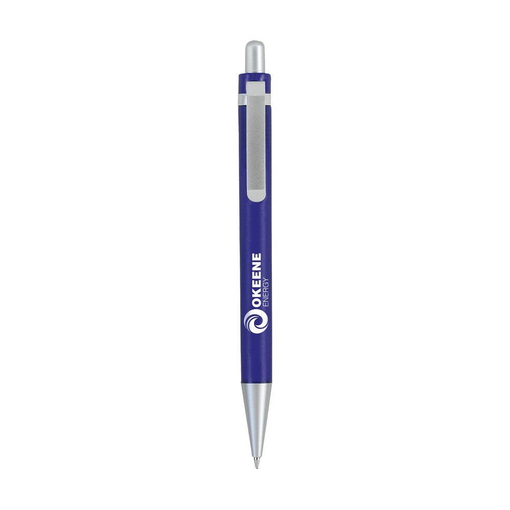 Blauschreibender Kugelschreiber mit transparentfarbenem Gehäuse und Clip aus Mattmetall. mehr