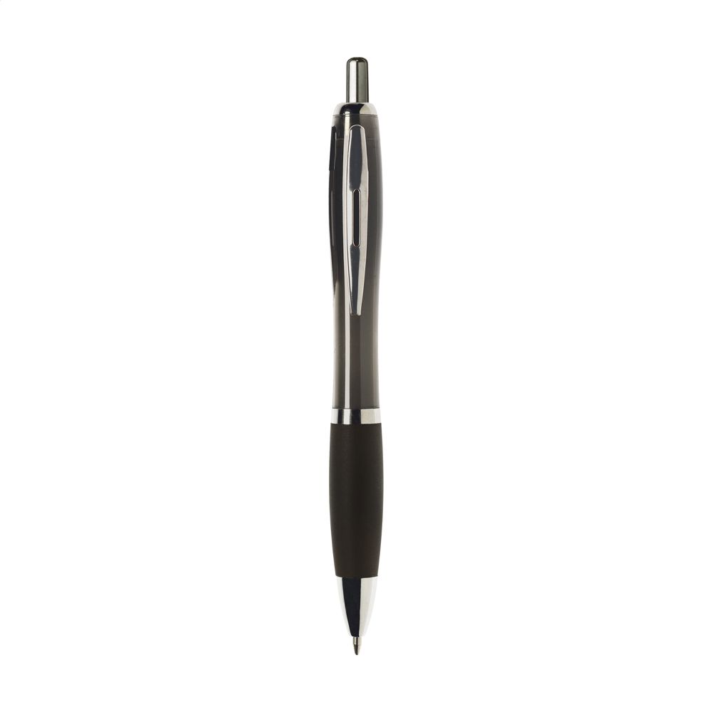 Blauschreibender oder schwarzschreibender Kugelschreiber mit transparentfarbener Gehäuse, grifffestem Vorderteil und Metallclip.
