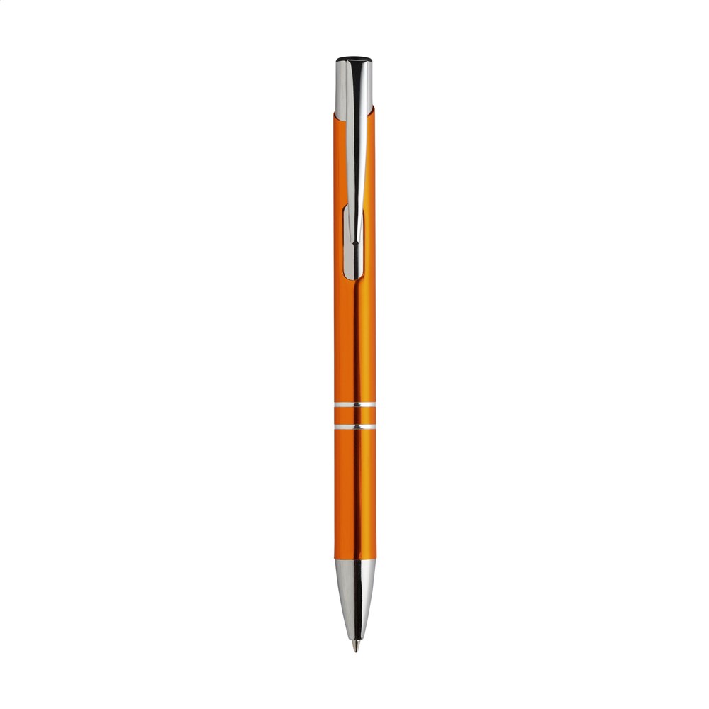 Blauschreibender Aluminiumkugelschreiber mit glänzendem Gehäuse in Metalloptik und metallenem Clip. mehr