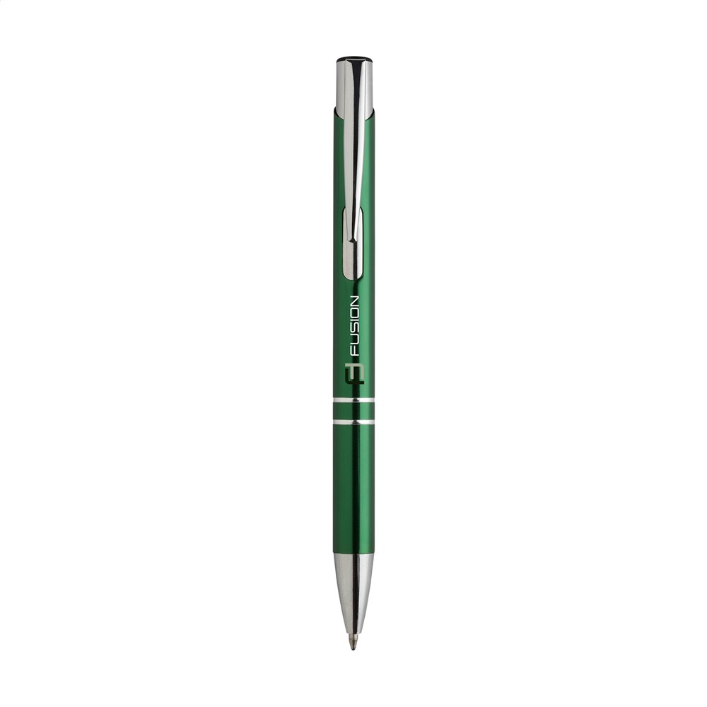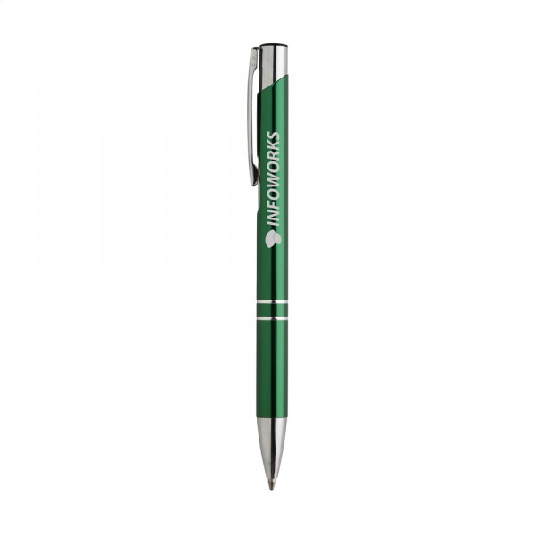 Blauschreibender Aluminiumkugelschreiber mit glänzendem Gehäuse in Metalloptik und metallenem Clip.
