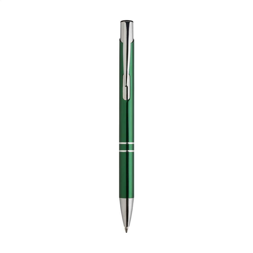 Blauschreibender Aluminiumkugelschreiber mit glänzendem Gehäuse in Metalloptik und metallenem Clip. mehr