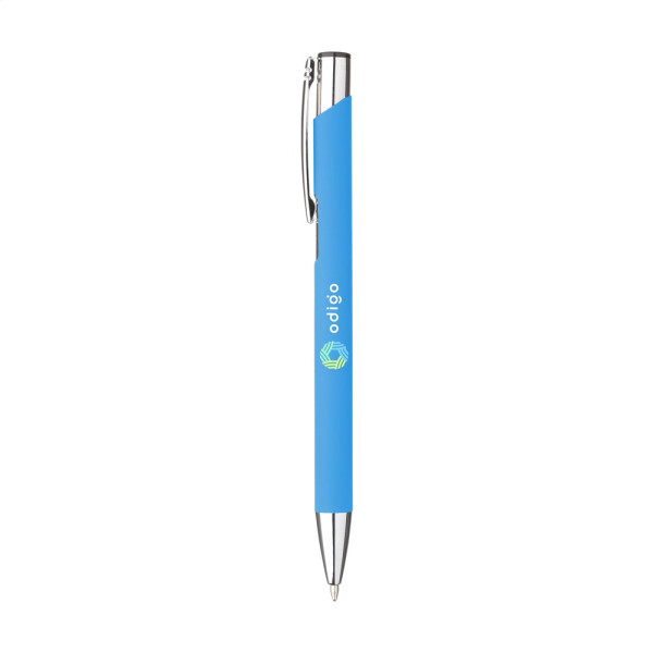 Blauschreibender Aluminium-Kugelschreiber mit Metallclip. Der Halter ist mit einer schönen gummierten Oberfläche versehen. Durch den einteiligen Halter bietet dieser Stift Platz für einen großen Aufdruck.