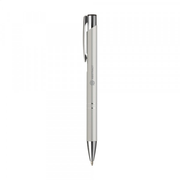 Blauschreibender oder schwarzschreibender Kugelschreiber aus Aluminium mit mattfarbenem Gehäuse in Metalloptik und metallenem Clip/Druckknopf.