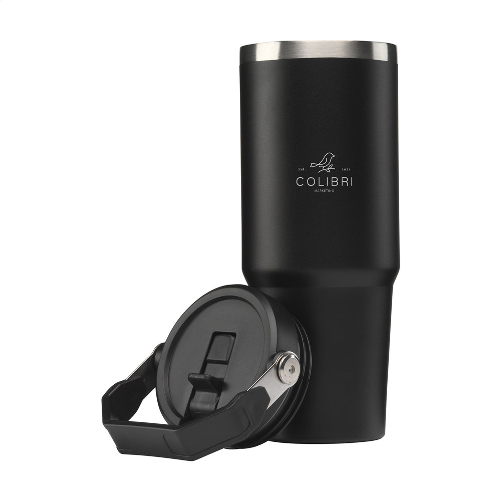 Großer, doppelwandiger Trinkbecher aus recyceltem Edelstahl mit Strohhalm. Der auffällige, robuste Becher hat einen großen, drehbaren Henkel und einen Schraubdeckel mit klappbarem Trinkauslauf und Strohhalm. Dieser große Becher hält Getränke lange Zeit auf Temperatur. Geeignet für kalte und heiße Getränke. Dieser Becher kann überall hin mitgenommen werden. Ideal für das Fitnessstudio oder das Büro. Dank des konischen, schmalen Bodens passt der Becher in fast jeden Becherhalter und ist somit perfekt für unterwegs. Nicht spülmaschinengeeignet. Gesamtes recyceltes Material: 73%. Fassungsvermögen: 900 ml. Verpackt pro Stück.