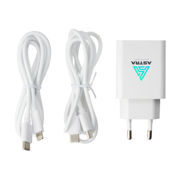 Ladegerät-Set aus recyceltem ABS. Dieses Set besteht aus einem Wandladegerät mit 2 separaten Ladekabeln: ein Kabel Typ-C zu Typ-C und ein Kabel Typ-C zu Lightning. Kabellänge: 100 cm. Inklusive Gebrauchsanweisung. Verpackt pro Set.
