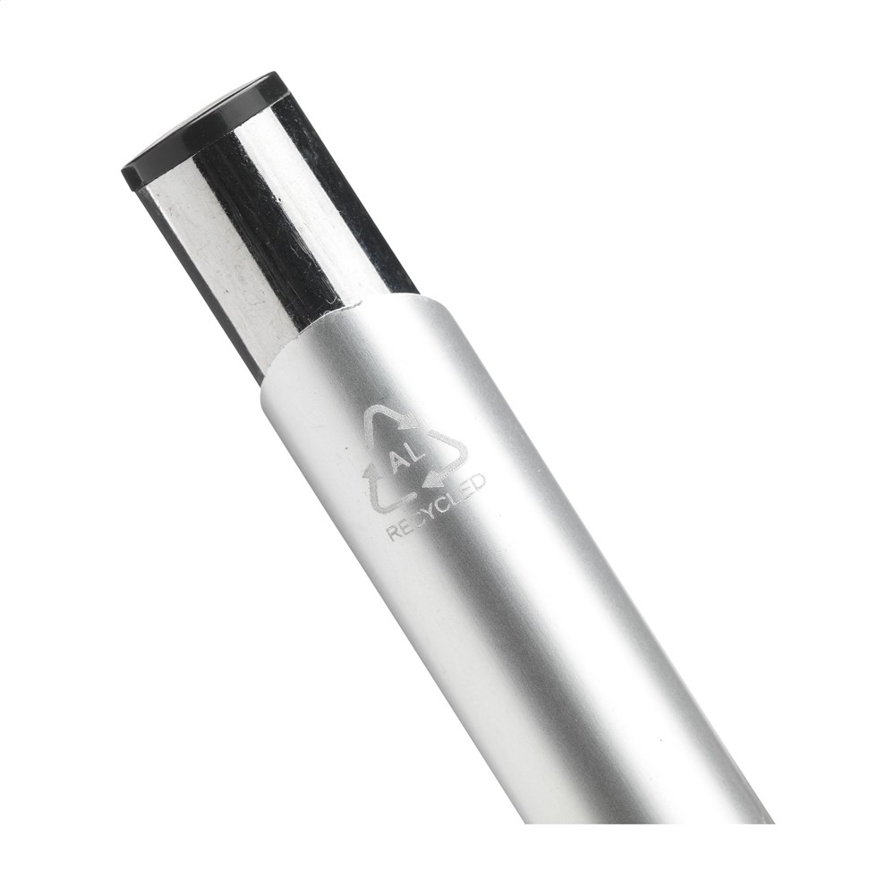 Blauschreibender Kugelschreiber aus recyceltem Aluminium. Der Halter ist mit einer wunderschön glänzenden Oberfläche im Metallic-Look versehen. Mit Metallclip. Durch die Verwendung von recyceltem Aluminium werden bei der Herstellung dieses Produkts weniger neue Rohstoffe verwendet. Das bedeutet weniger Energieverbrauch und weniger Wasserverbrauch.
