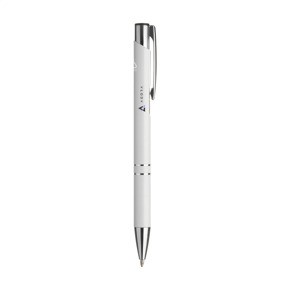 Blauschreibender Kugelschreiber aus recyceltem Aluminium. Der Halter ist mit einer wunderschön glänzenden Oberfläche im Metallic-Look versehen. Mit Metallclip. Durch die Verwendung von recyceltem Aluminium werden bei der Herstellung dieses Produkts weniger neue Rohstoffe verwendet. Das bedeutet weniger Energieverbrauch und weniger Wasserverbrauch.